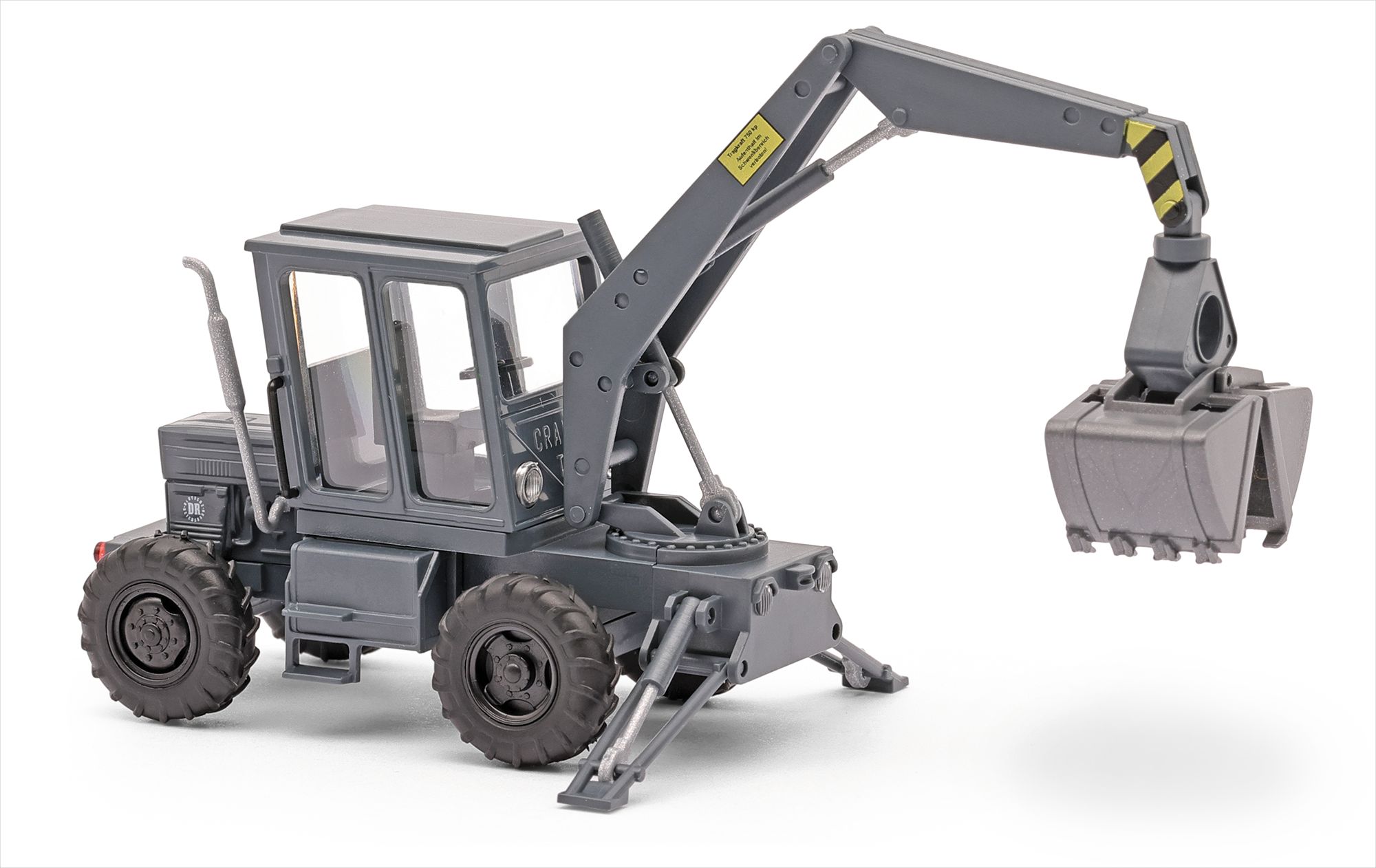 Das Modell mit Zwillingsbereifung ist mit Ladearm und Schaufel ausgestattet.
