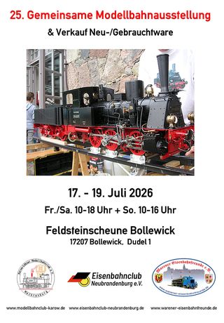 Der Eisenbahnclub Neubrandenburg, die Warener Eisenbahnfreunde und der Karow-Lübzer Modellbahnclub laden zur 25. Modellbahnausstellung in Deutschlands größter Feldsteinscheune in Bollewick bei Röbel ein. Traditionell im Juli, passend zur Urlaubszeit, haben wir uns zum Jubiläum viele Gäste mit besonderen Anlagen eingeladen. Natürlich sind auch wieder Kinderspielanlagen dabei.